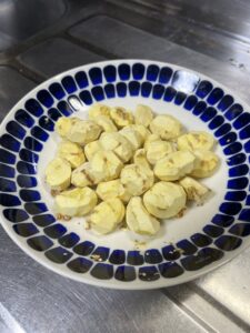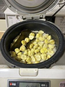 昆布、酒、醤油を少々、栗おこわの神様にお祈りして炊飯器のスイッチを押すと・・・