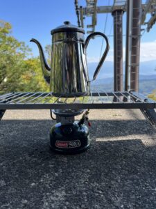 リフト降り場で昼休憩。みんなでコーヒーを飲むために湯を沸かす田川。